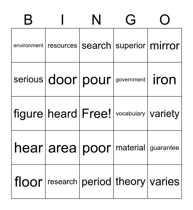 This bingo card has a free space and 39 words: cover, discover, recover, door, floor, poor, pour, tour, mirror, hear, heard, superior, varies, variety, vocabulary, area, garage, environment, experience, material, serious, period, government, iron, library, purpose, course, source, resource, resources, court, color, search, research, theory, theories, guarantee, figure and vary.