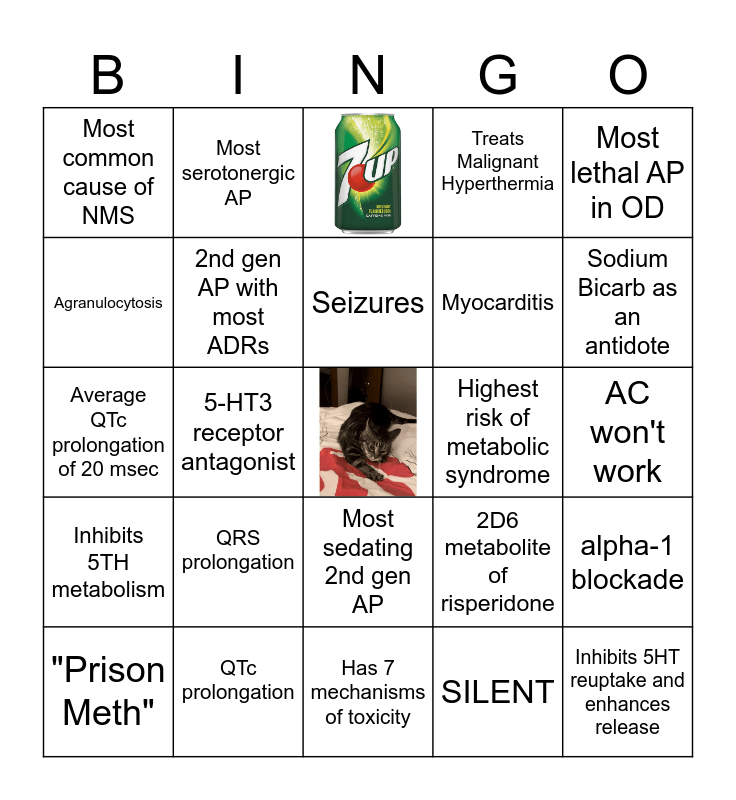 This bingo card has 23 images, a free space and 23 words: QRS prolongation, QTc prolongation, Seizures, "Prison Meth", Most lethal AP in OD, Most common cause of NMS, Agranulocytosis, Most serotonergic AP, Highest risk of metabolic syndrome, Most sedating 2nd gen AP, Myocarditis, Average QTc prolongation of 20 msec, 2D6 metabolite of risperidone, alpha-1 blockade, 2nd gen AP with most ADRs, SILENT, AC won't work, Sodium Bicarb as an antidote, 5-HT3 receptor antagonist, Inhibits 5HT reuptake and enhances release, Inhibits 5TH metabolism, Treats Malignant Hyperthermia and Has 7 mechanisms of toxicity.