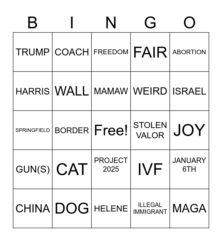 This bingo card has a free space and 24 words: CAT, DOG, MAMAW, CHINA, ABORTION, TRUMP, HARRIS, COACH, STOLEN VALOR, PROJECT 2025, WEIRD, SPRINGFIELD, IVF, JANUARY 6TH, WALL, ILLEGAL IMMIGRANT, JOY, FREEDOM, ISRAEL, BORDER, MAGA, GUN(S), FAIR and HELENE.