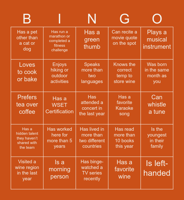 This bingo card has a free space and 24 words: Has worked here for more than 5 years, Is a morning person, Speaks more than two languages, Visited a wine region in the last year, Plays a musical instrument, Has a pet other than a cat or dog, Loves to cook or bake, Has run a marathon or completed a fitness challenge, Has a favorite Karaoke song, Has lived in more than two different countries, Knows the correct temp to store wine, Prefers tea over coffee, Has read more than 10 books this year, Is the youngest in their family, Enjoys hiking or outdoor activities, Has a favorite wine, Can whistle a tune, Has a green thumb, Was born in the same month as you, Has a WSET Certification, Is left-handed, Has a hidden talent they haven’t shared with the team, Can recite a movie quote on the spot and Has binge-watched a TV series recently.