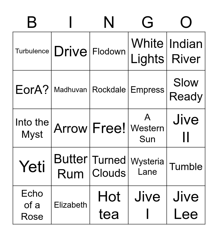 This bingo card has a free space and 31 words: Hot tea, Arcadia, Arrow, Hot love, Turbulence, Flodown, Madhuvan, Wysteria Lane, A Western Sun, Jive I, Jive II, Jive Lee, All I Need, So Ready, Slow Ready, Creatures, Tumble, Butter Rum, Yeti, Turned Clouds, Indian River, Time to Flee, Echo of a Rose, Drive, Empress, EorA?, White Lights, Into the Myst, Elizabeth, Rockdale and Hungersite.