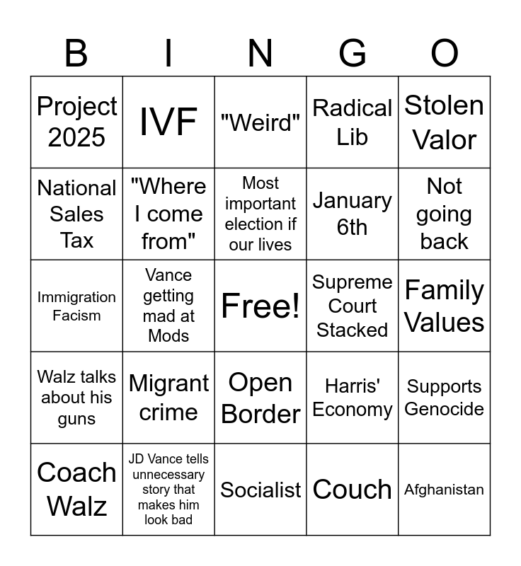 This bingo card has a free space and 24 words: Migrant crime, JD Vance tells unnecessary story that makes him look bad, Most important election if our lives, Coach Walz, Stolen Valor, Project 2025, National Sales Tax, IVF, Supreme Court Stacked, Open Border, January 6th, Immigration Facism, Harris' Economy, Supports Genocide, "Where I come from", Couch, Family Values, "Weird", Not going back, Vance getting mad at Mods, Afghanistan, Walz talks about his guns, Radical Lib and Socialist.