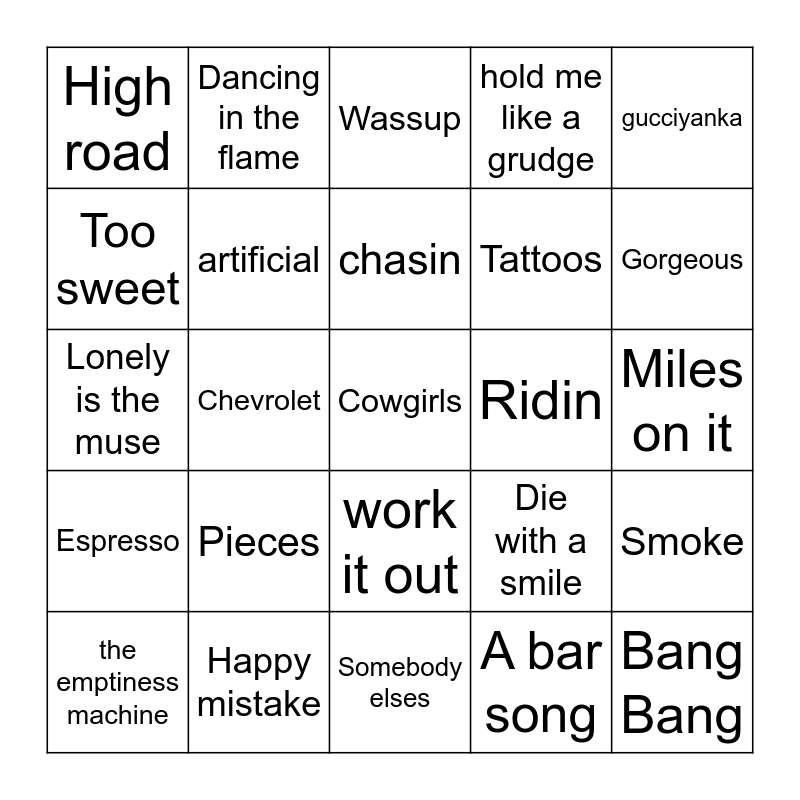 This bingo card has a free space and 28 words: Smoke, Houdini, Tattoos, A bar song, Too sweet, Wassup, Dancing in the flame, Espresso, Ridin, the emptiness machine, Lonely is the muse, hold me like a grudge, Happy mistake, Somebody elses, Gorgeous, Bad dreams, Pieces, artificial, chasin, work it out, High road, Casamigos, Bang Bang, Chevrolet, Miles on it, Die with a smile, gucciyanka and Betrayal.
