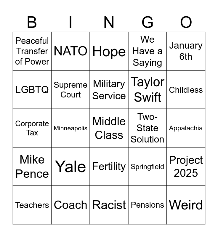 This bingo card has a free space and 24 words: Yale, Coach, Military Service, Teachers, January 6th, Peaceful Transfer of Power, LGBTQ, NATO, Two-State Solution, Fertility, Taylor Swift, Corporate Tax, Springfield, Project 2025, Supreme Court, Pensions, Appalachia, Hope, Childless, Minneapolis, Weird, Mike Pence, We Have a Saying and Racist.