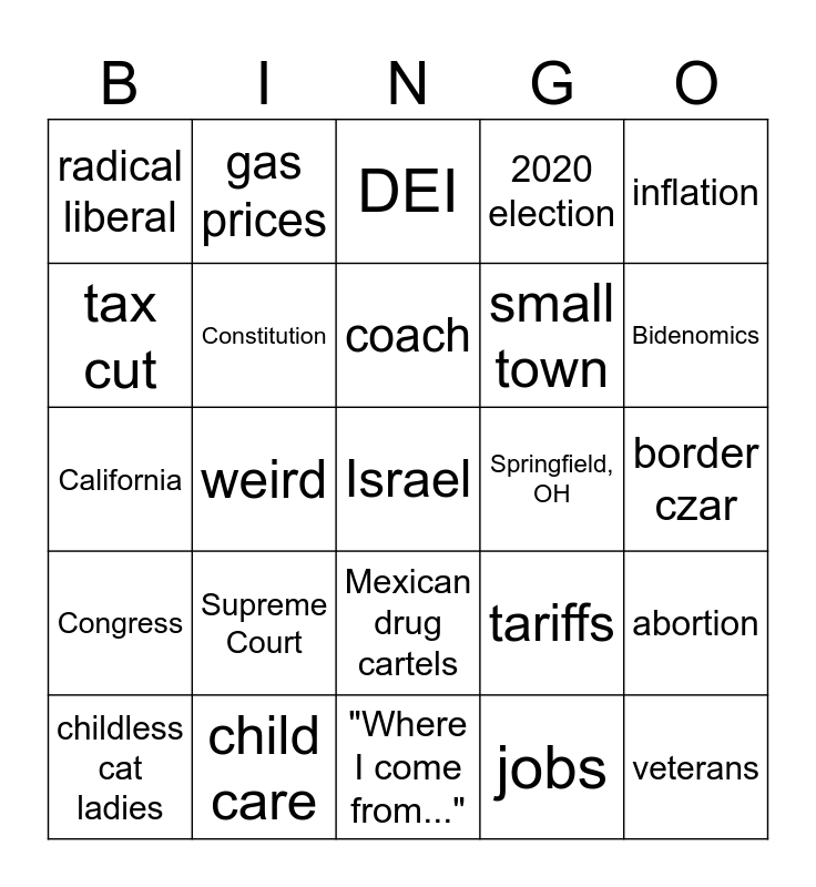 This bingo card has 39 words: more of the same, immigrants, Ukraine, Constitution, childless cat ladies, Mexican drug cartels, coach, assassination attempt, inflation, Congress, weird, 2020 election, Israel, border czar, Springfield, OH, Supreme Court, IVF, radical liberal, abortion, tariffs, tax cut, "Where I come from...", small town, Bidenomics, Covid, Ivy league, veterans, Hamas, dangerous, gas prices, Project 2025, "Oh for..", DEI, child care, jobs, millionaires, abortion, California and tariffs.