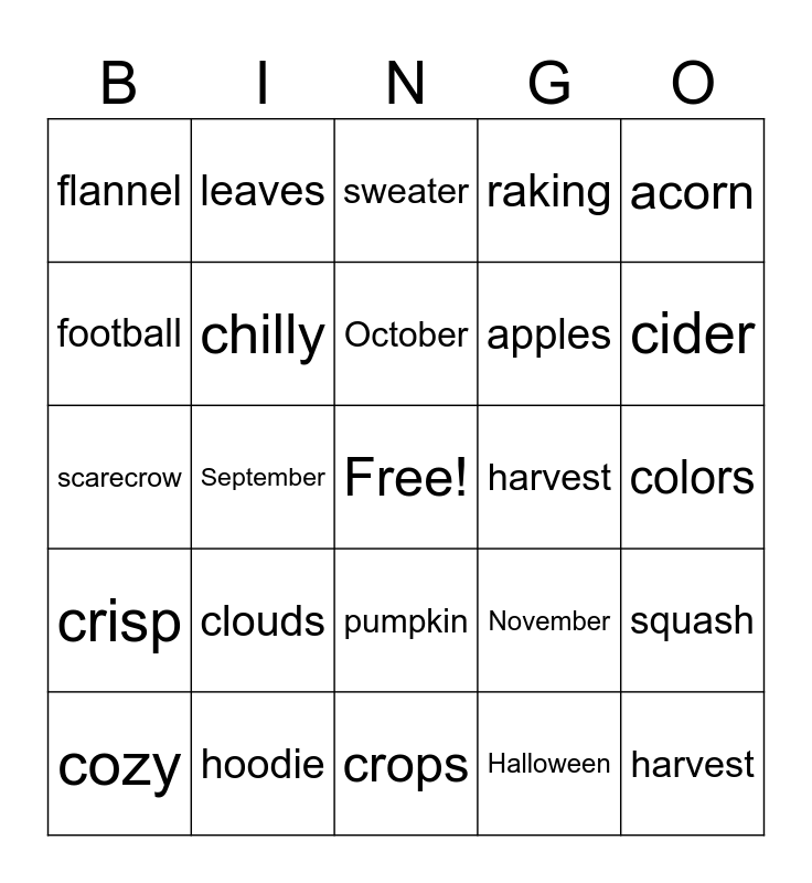 This bingo card has a free space and 24 words: clouds, hoodie, October, cozy, acorn, flannel, football, leaves, harvest, pumpkin, apples, scarecrow, November, squash, chilly, Halloween, colors, sweater, cider, September, harvest, crisp, raking and crops.
