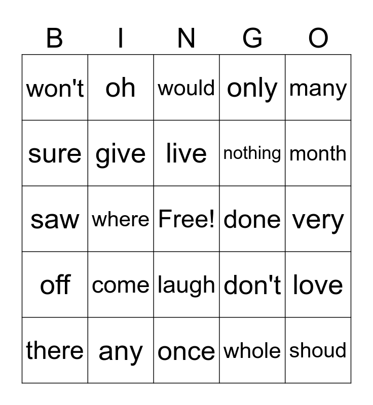 This bingo card has a free space and 26 words: laugh, whole, live, any, many, won't, sure, oh, very, don't, nothing, saw, love, there, where, because, only, off, would, shoud, month, once, done, come, give and your.