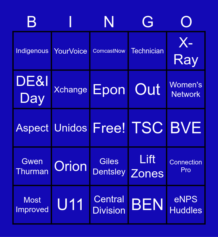 This bingo card has a free space and 52 words: Gigabit, eNPS Huddles, Comcast Business, Central Division, Orion, Customer Service Week, YourVoice, Xfinity, DE&I Day, Peacock, Xchange, Wifi Pro, Connection Pro, Lift Zones, Workday, X1, Epon, TSC, CSG/ACSR, X-Ray, Unidos, BEN, Indigenous, Out, YPN, APA, Veterans Network, MyAbilities Network, Women's Network, gDTA, Storm Ready Wifi, Technician, Innovation, OneCTI, XPE, ComcastNow, U11, Excel, UTO, PTO, Metro E, BVE, Gwen Thurman, Kimberly Bachmann, Giles Dentsley, Dale Mathurin, Brandee Young-Salter, Aspect, Awesome Award, Top Performer, Most Improved and S.O.M.A.