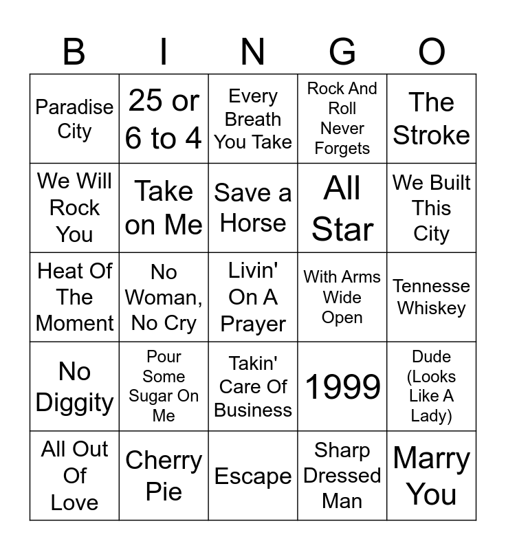 This bingo card has a free space and 39 words: Sweet Emotion, Rockin' Into The Night, Because I Got High, Take on Me, All Out Of Love, Takin' Care Of Business, Save a Horse, Mony Mony, The Stroke, No Diggity, No Woman, No Cry, Rock And Roll Never Forgets, Marry You, Tennesse Whiskey, With Arms Wide Open, Pour Some Sugar On Me, Go Your Own Way, Paradise City, Fireball, 1999, We Will Rock You, Escape, All Star, We Built This City, We Got The Beat, Love Stinks, It's Raining Men, I Wanna Rock, Iron Man, 25 or 6 to 4, Crazy Little Thing Called Love, Man! I Feel Like A Woman!, Every Breath You Take, Cherry Pie, Sharp Dressed Man, Kryptonite, Dude (Looks Like A Lady), Heat Of The Moment and Hungry Like the Wolf.