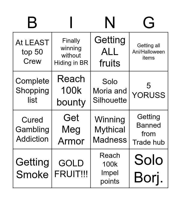 This bingo card has 16 words: GOLD FRUIT!!!, Getting Banned from Trade hub, Getting ALL fruits, At LEAST top 50 Crew, Cured Gambling Addiction, Finally winning without Hiding in BR, Winning Mythical Madness, Reach 100k Impel points, Complete Shopping list, Reach 100k bounty, Getting Smoke, Getting all Ani/Halloween items, Get Meg Armor, 5 YORUSS, Solo Moria and Silhouette and Solo Borj..