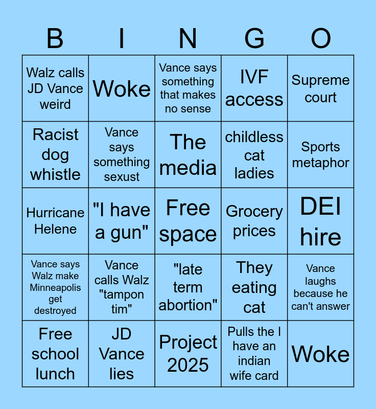 This bingo card has a free space and 24 words: Vance calls Walz "tampon tim", JD Vance lies, The media, Free school lunch, Supreme court, Walz calls JD Vance weird, Racist dog whistle, Woke, Grocery prices, "late term abortion", childless cat ladies, Hurricane Helene, They eating cat, Vance laughs because he can't answer, Vance says something sexust, Pulls the I have an indian wife card, DEI hire, Vance says something that makes no sense, Sports metaphor, "I have a gun", Woke, Vance says Walz make Minneapolis get destroyed, IVF access and Project 2025.