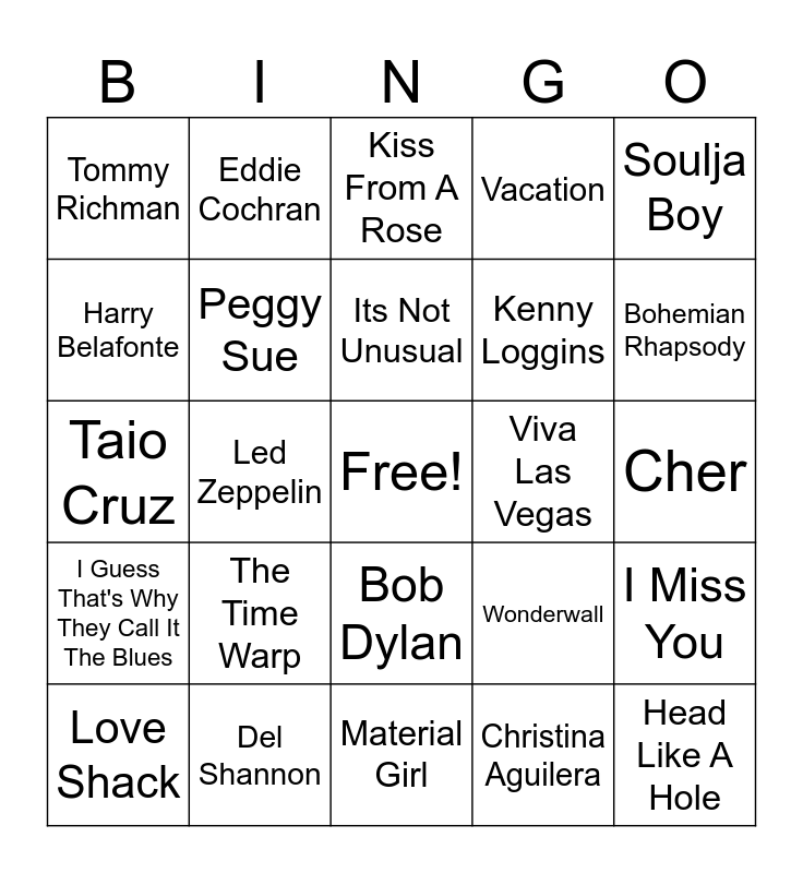This bingo card has a free space and 24 words: The Time Warp, Del Shannon, Its Not Unusual, Love Shack, Soulja Boy, Tommy Richman, Harry Belafonte, Eddie Cochran, Viva Las Vegas, Bob Dylan, Kenny Loggins, Taio Cruz, Wonderwall, I Miss You, Peggy Sue, Christina Aguilera, Cher, Kiss From A Rose, Bohemian Rhapsody, Led Zeppelin, Head Like A Hole, I Guess That's Why They Call It The Blues, Vacation and Material Girl.