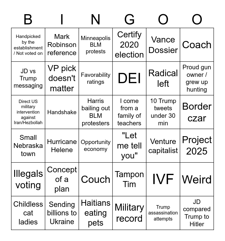This bingo card has 36 words: Tampon Tim, Couch, Military record, JD vs Trump messaging, Small Nebraska town, I come from a family of teachers, VP pick doesn't matter, Haitians eating pets, Vance Dossier, IVF, Proud gun owner / grew up hunting, Certify 2020 election, Weird, Handshake, DEI, Handpicked by the establishment / Not voted on, Illegals voting, 10 Trump tweets under 30 min, Direct US military intervention against Iran/Hezbollah, Minneapolis BLM protests, Harris bailing out BLM protesters, Hurricane Helene, "Let me tell you", Opportunity economy, Venture capitalist, Mark Robinson reference, Radical left, Sending billions to Ukraine, Favorability ratings, Coach, JD compared Trump to Hitler, Childless cat ladies, Project 2025, Border czar, Concept of a plan and Trump assassination attempts.
