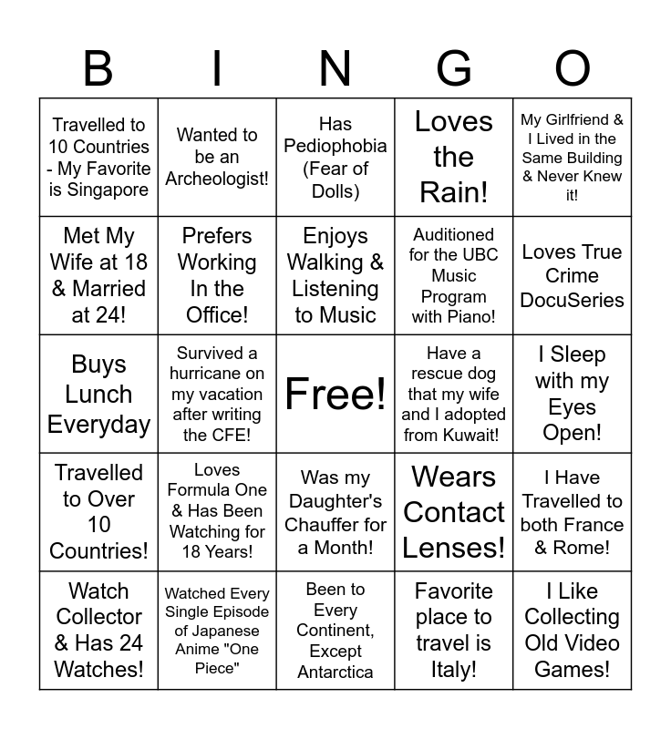 This bingo card has a free space and 24 words: Loves Formula One & Has Been Watching for 18 Years!, Watched Every Single Episode of Japanese Anime "One Piece", Enjoys Walking & Listening to Music, Watch Collector & Has 24 Watches!, My Girlfriend & I Lived in the Same Building & Never Knew it!, Travelled to 10 Countries - My Favorite is Singapore, Met My Wife at 18 & Married at 24!, Wanted to be an Archeologist!, Have a rescue dog that my wife and I adopted from Kuwait!, Was my Daughter's Chauffer for a Month!, Auditioned for the UBC Music Program with Piano!, Buys Lunch Everyday, Wears Contact Lenses!, I Have Travelled to both France & Rome!, Prefers Working In the Office!, Favorite place to travel is Italy!, I Sleep with my Eyes Open!, Has Pediophobia (Fear of Dolls), Loves True Crime DocuSeries, Survived a hurricane on my vacation after writing the CFE!, I Like Collecting Old Video Games!, Travelled to Over 10 Countries!, Loves the Rain! and Been to Every Continent, Except Antarctica.