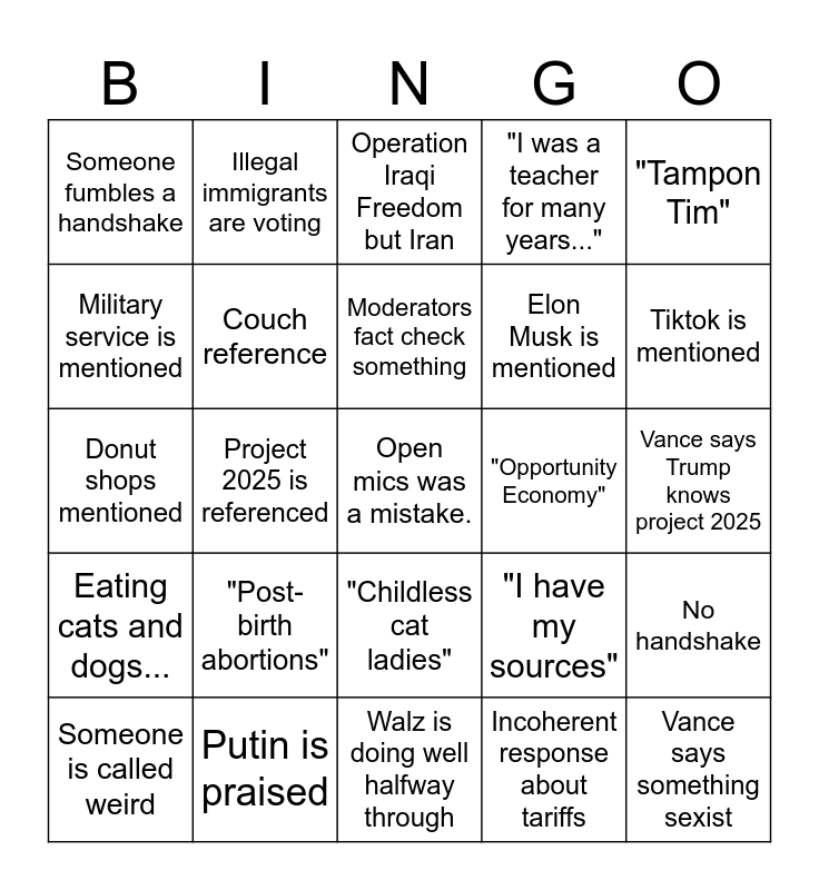 This bingo card has a free space and 39 words: Springfield, Ohio, Question about Vance criticizing Trump, Football analogy, Couch reference, Someone is called weird, "Childless cat ladies", Moderators fact check something, Trump's age is mentioned, "Tampon Tim", Eating cats and dogs..., Project 2025 is referenced, "I was a teacher for many years...", Vance says something sexist, Vance says Trump knows project 2025, "Opportunity Economy", "Post-birth abortions", Haiti is mentioned, Someone fumbles a handshake, "I create stories", "I have my sources", Military service is mentioned, Walz is doing well halfway through, Elon Musk is mentioned, Tiktok is mentioned, Hannibal Lecter, "Black jobs", Thinly-veiled racism, Thinly-veiled homophobia, Absolutely off the rails response, Illegal immigrants are voting, "Israel is our greatest ally", Hezbollah confused with Hamas, Operation Iraqi Freedom but Iran, Putin is praised, Incoherent response about tariffs, Eating pets (other than cat/dog), No handshake, Donut shops mentioned and Vance gets mad at moderators.