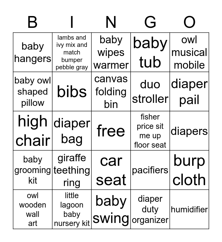 This bingo card has a free space and 24 words: giraffe teething ring, little lagoon baby nursery kit, canvas folding bin, owl wooden wall art, owl musical mobile, baby hangers, baby owl shaped pillow, lambs and ivy mix and match bumper pebble gray, fisher price sit me up floor seat, car seat, duo stroller, high chair, pacifiers, burp cloth, bibs, diaper duty organizer, diapers, baby wipes warmer, diaper pail, diaper bag, humidifier, baby grooming kit, baby tub and baby swing.