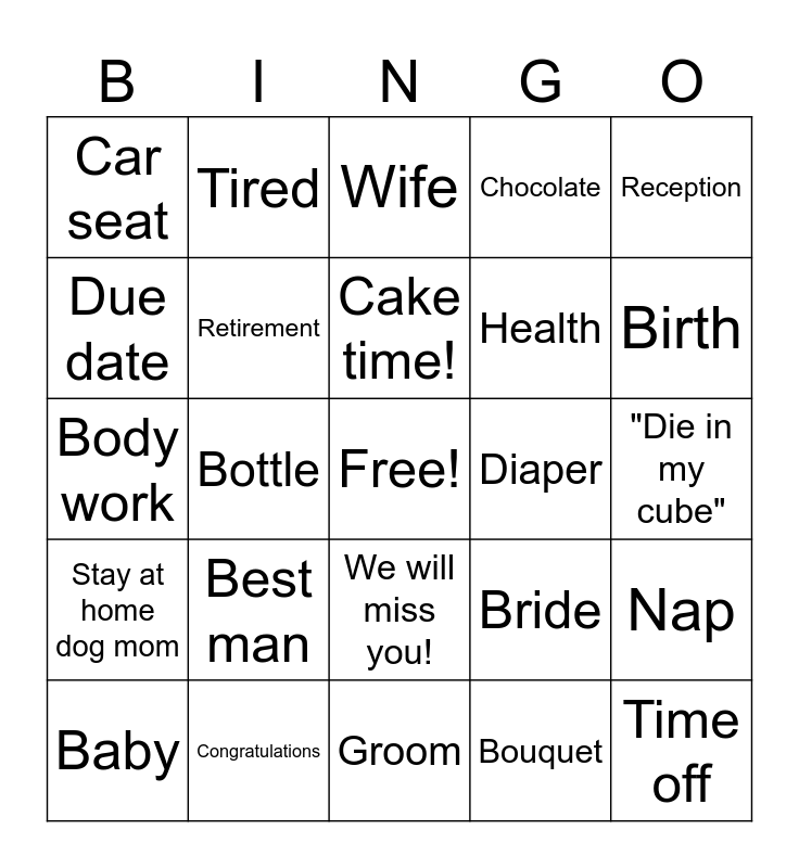 This bingo card has a free space and 29 words: Baby, After party, Bottle, Guest, Car seat, Wife, Retirement, Best man, Diaper, Congratulations, "Die in my cube", Time off, Groom, Bouquet, Birth, Honeymoon, We will miss you!, Stay at home dog mom, Reception, Body work, Bride, Ruby, Health, Due date, Chocolate, Tired, Nap, Cake time! and Let's eat!.