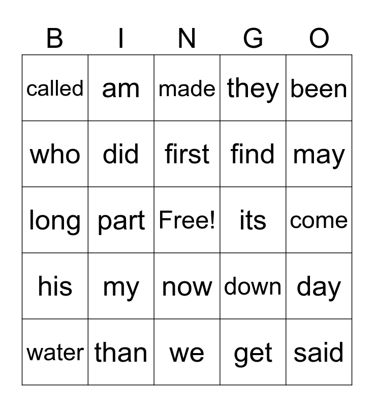 This bingo card has a free space and 24 words: my, than, first, water, been, called, who, am, its, now, find, long, down, day, did, get, come, made, may, part, said, his, they and we.