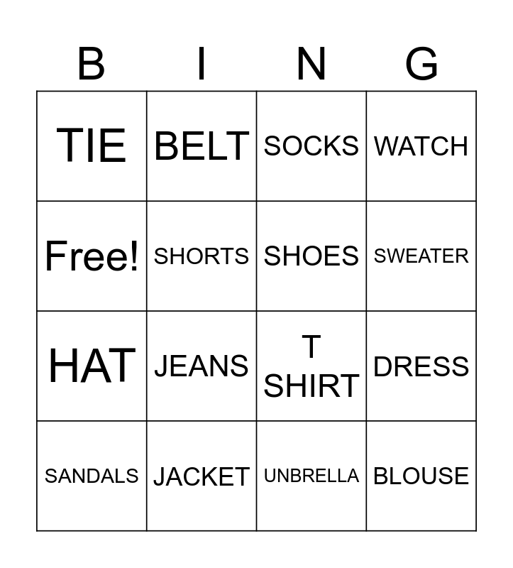 This bingo card has 16 words: JACKET, DRESS, SOCKS, TIE, HAT, BELT, T SHIRT, UNBRELLA, Free!, SHORTS, SANDALS, WATCH, JEANS, SWEATER, SHOES and BLOUSE.
