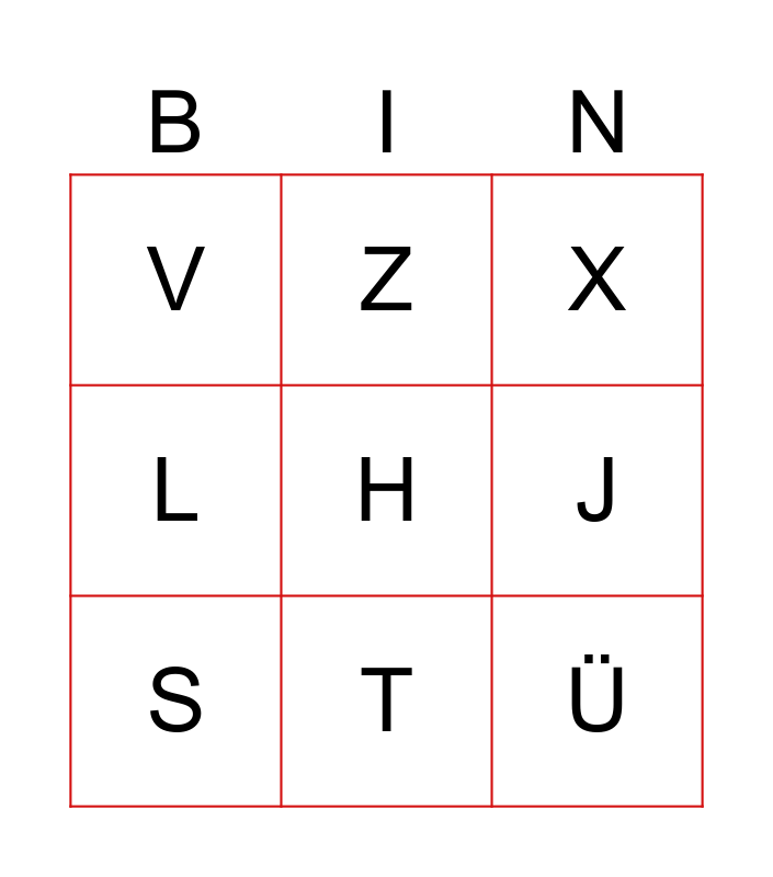 This bingo card has a free space and 28 words: A, V, C, D, J, X, Z, Z, I, J, K, L, N, O, P, Q, R, S, T, U, V, W, X, Z, Ä, Ö, Ü and ß.