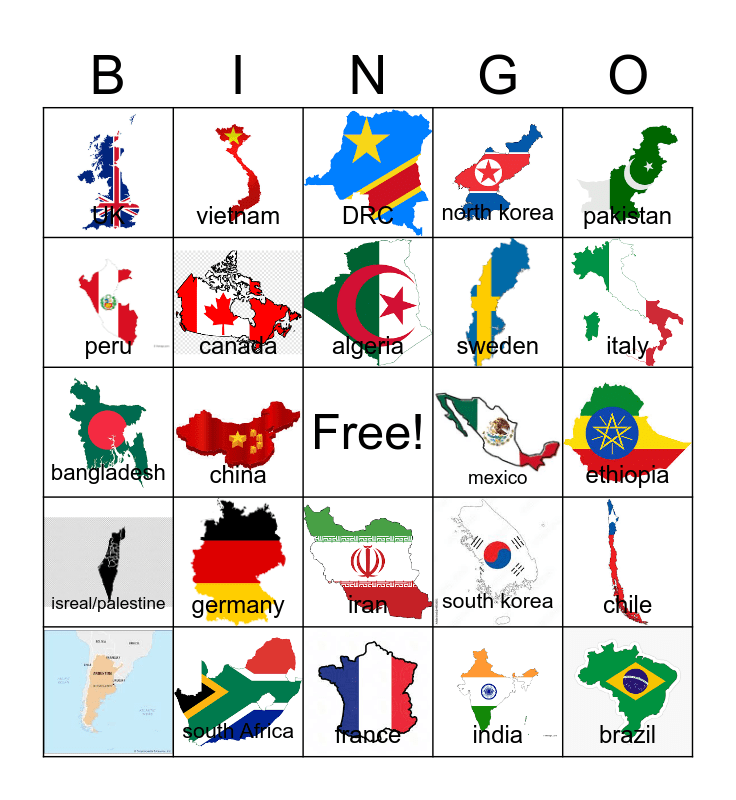 This bingo card has 29 images, a free space and 26 words: china, russia, UK, DRC, canada, germany, mexico, south Africa, ethiopia, brazil, france, india, italy, venezuela, iran, isreal/palestine, pakistan, bangladesh, south korea, ukraine, sweden, peru, north korea, vietnam, chile and algeria.