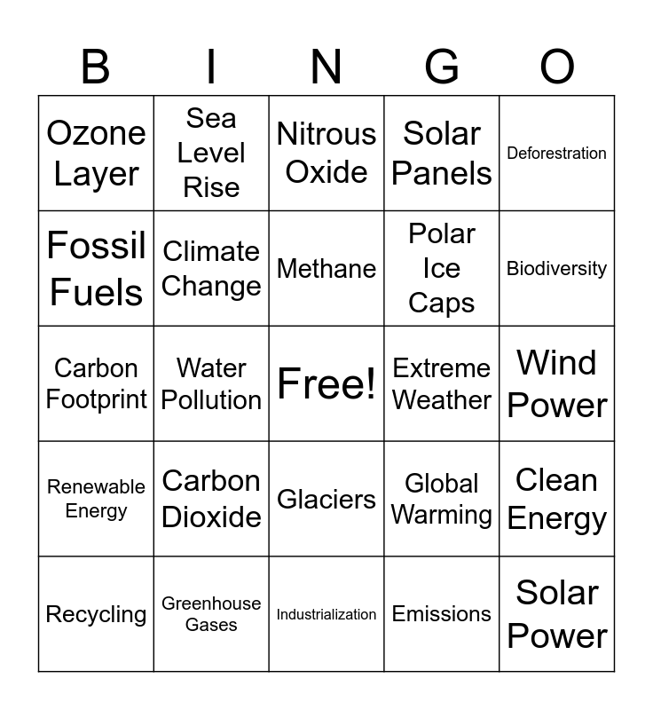 This bingo card has a free space and 24 words: Carbon Dioxide, Greenhouse Gases, Methane, Recycling, Deforestration, Ozone Layer, Fossil Fuels, Sea Level Rise, Extreme Weather, Glaciers, Polar Ice Caps, Carbon Footprint, Global Warming, Clean Energy, Climate Change, Emissions, Wind Power, Nitrous Oxide, Biodiversity, Water Pollution, Solar Power, Renewable Energy, Solar Panels and Industrialization.