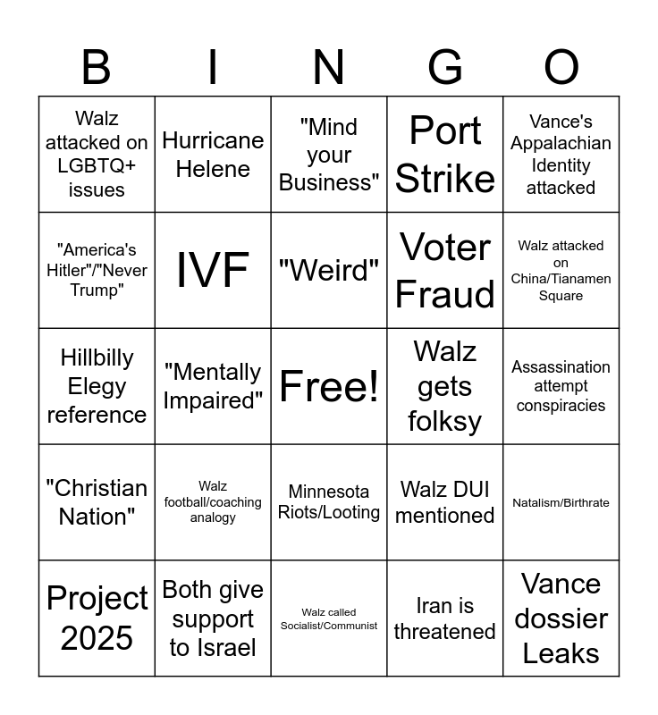 This bingo card has a free space and 24 words: Walz football/coaching analogy, Both give support to Israel, "Weird", Project 2025, Vance's Appalachian Identity attacked, Walz attacked on LGBTQ+ issues, "America's Hitler"/"Never Trump", Hurricane Helene, Walz gets folksy, Minnesota Riots/Looting, Voter Fraud, Hillbilly Elegy reference, Walz DUI mentioned, Natalism/Birthrate, IVF, Iran is threatened, Assassination attempt conspiracies, "Mind your Business", Walz attacked on China/Tianamen Square, "Mentally Impaired", Vance dossier Leaks, "Christian Nation", Port Strike and Walz called Socialist/Communist.