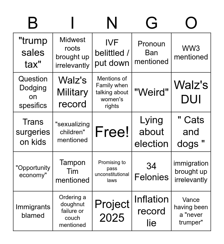 This bingo card has a free space and 24 words: Tampon Tim mentioned, Ordering a doughnut failure or couch mentioned, Mentions of Family when talking about women's rights, Immigrants blamed, WW3 mentioned, "trump sales tax", Question Dodging on spesifics, Midwest roots brought up irrelevantly, Lying about election, Promising to pass unconstitutional laws, "Weird", Trans surgeries on kids, 34 Felonies, immigration brought up irrelevantly, Walz's Military record, Inflation record lie, " Cats and dogs ", IVF belittled / put down, Walz's DUI, "sexualizing children" mentioned, Vance having been a "never trumper", "Opportunity economy", Pronoun Ban mentioned and Project 2025.