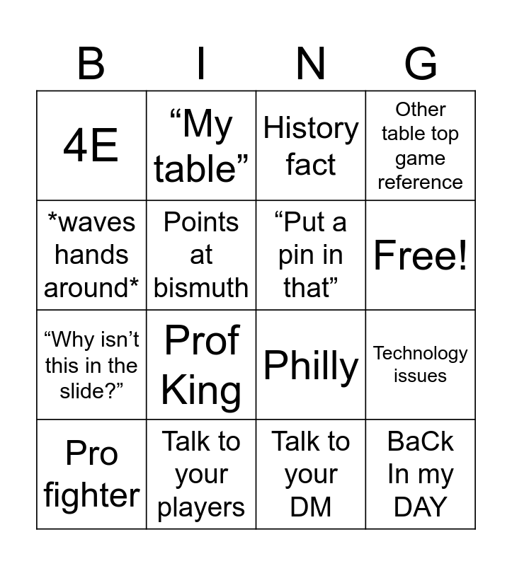 This bingo card has 18 words: Prof King, BaCk In my DAY, History fact, 4E, Philly, Other table top game reference, Pro fighter, “My table”, Free!, “Why isn’t this in the slide?”, Talk to your DM, *waves hands around*, Technology issues, Points at bismuth, “Put a pin in that”, Holds up PHB, Talk to your players and Pro Human.