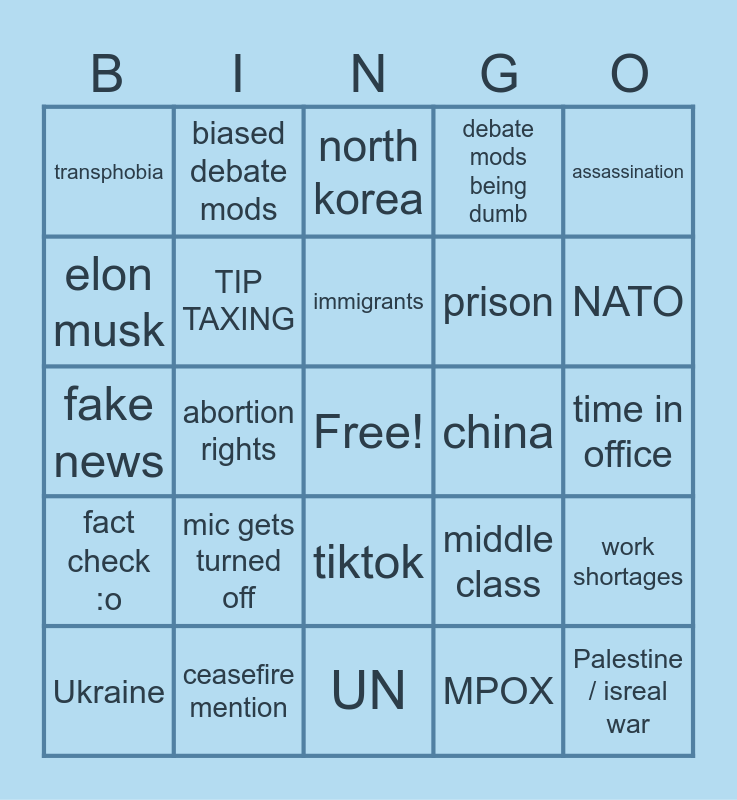 This bingo card has a free space and 39 words: big number mention (-illions), debts, inflation, TIP TAXING, Ukraine, tiktok, immigrants, police, assassination, fact check :o, abortion rights, debate mods being dumb, Palestine / isreal war, time in office, china, mic gets turned off, benefits (healthcare, ect.), transphobia, Russia, middle class, elon musk, UN, prison, NATO, project 2025, jan 6th, kamala mention, trump mention, 9/11 mention, biased debate mods, republican / democrat convention mention, COVID, north korea, ceasefire mention, MPOX, drugs / fentanyl, work shortages, fake news and hurricane helene.