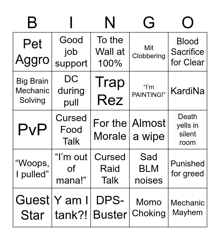 This bingo card has a free space and 40 words: Forgot Callout, PvP, Gear Broken, DC during pull, Y am I tank?!, Cursed Raid Talk, Trap Rez, Self Murder, Blood Sacrifice for Clear, “Woops, I pulled”, Cursed Food Talk, Mit Clobbering, Mechanic Mayhem, Death yells in silent room, Almost a wipe, “I’m out of mana!”, Mechanic ESP, Pet Aggro, Call IT, To the Wall at 100%, Punished for greed, Momo Choking, “I’m PAINTING!”, Big Brain Mechanic Solving, Confident but Wrong, Not-Confident but Right, No, You Die, Food Fell Off, Mechanic Opposite PF, “I just used ____!”, Tank Forgets Stance, Guest Star, “My Ley/Gay Lines!”, Sad BLM noises, KardiNa, DPS-Buster, “My mic was muted.”, Musical Callouts, Good job support and Good job dps.
