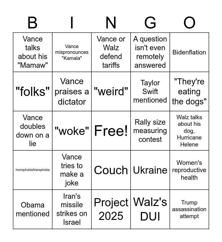 This bingo card has a free space and 26 words: Couch, Walz's DUI, "weird", Iran's missile strikes on Israel, Bidenflation, Vance talks about his "Mamaw", "folks", Vance mispronounces "Kamala", Walz talks about his dog, Hurricane Helene, Ukraine, Taylor Swift mentioned, Vance doubles down on a lie, Women's reproductive health, Obama mentioned, "woke", Eric Adams indictment, A question isn't even remotely answered, homophobia/transphobia, Vance or Walz defend tariffs, Trump assassination attempt, "They're eating the dogs", Project 2025, Rally size measuring contest, Vance tries to make a joke, Vance praises a dictator and The Border.