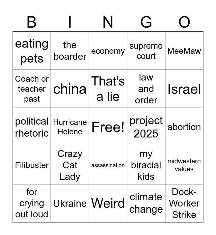This bingo card has a free space and 25 words: Crazy Cat Lady, Weird, That's a lie, for crying out loud, MeeMaw, eating pets, Coach or teacher past, the boarder, project 2025, assassination, law and order, political rhetoric, my biracial kids, midwestern values, china, service record, abortion, economy, Israel, Hurricane Helene, Dock-Worker Strike, Ukraine, Filibuster, supreme court and climate change.
