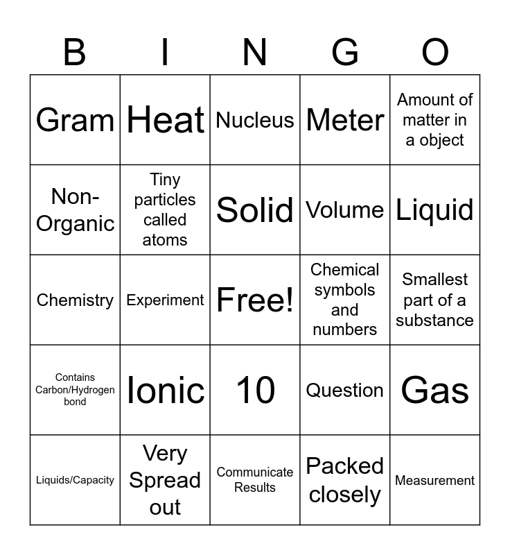 This bingo card has a free space and 47 words: Draw Conclusion, Measurement, Research, Communicate Results, Ionic, Electrons, Heat, Loosely Packed, Non-Organic, Atomic Number, Tiny particles called atoms, Meter, Gas, Question, Hypothesize, Scientific Theory, Solid, Chemical symbols and numbers, Name, Amount of matter in a object, Experiment, Packed closely, Gram, Volume, Biology, Liquid, Liquids/Capacity, Arrangement of Atoms, 10, Contains Carbon/Hydrogen bond, Weight/Mass, Length/ Distance, Atomic Mass, Electron Orbit, Positive Charge, Very Spread out, Smallest part of a substance, Physics, Valence Electron, Law of Conservation of mass, Covalent, Nucleus, Chemistry, Has mass and occupies space, Negative Charge, Science and Symbol.
