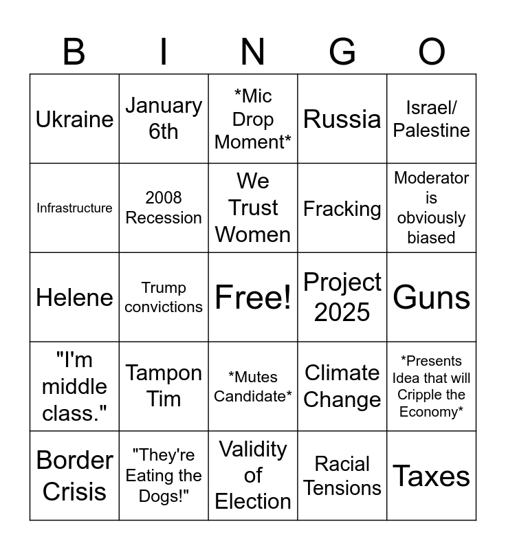 This bingo card has a free space and 24 words: Tampon Tim, "They're Eating the Dogs!", We Trust Women, Border Crisis, Israel/ Palestine, Ukraine, Infrastructure, January 6th, Project 2025, *Mutes Candidate*, Fracking, Helene, Climate Change, *Presents Idea that will Cripple the Economy*, 2008 Recession, Racial Tensions, Guns, *Mic Drop Moment*, Moderator is obviously biased, Trump convictions, Taxes, "I'm middle class.", Russia and Validity of Election.