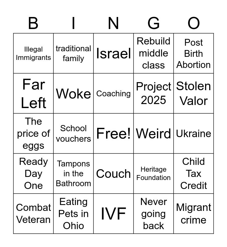 This bingo card has a free space and 24 words: Tampons in the Bathroom, Eating Pets in Ohio, Coaching, Combat Veteran, Post Birth Abortion, Illegal Immigrants, Far Left, traditional family, Weird, Couch, Project 2025, The price of eggs, Heritage Foundation, Child Tax Credit, Woke, Never going back, Ukraine, Israel, Stolen Valor, School vouchers, Migrant crime, Ready Day One, Rebuild middle class and IVF.