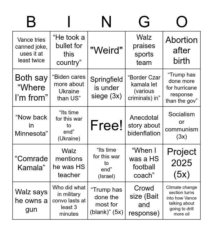 This bingo card has a free space and 24 words: Walz mentions he was HS teacher, Who did what in military convo lasts at least 3 minutes, Springfield is under siege (3x), Walz says he owns a gun, Abortion after birth, Vance tries canned joke, uses it at least twice, Both say “Where I’m from”, “He took a bullet for this country”, Anecdotal story about bidenflation, “Its time for this war to end” (Israel), “Border Czar kamala let (various criminals) in”, “Now back in Minnesota”, “When I was a HS football coach”, Project 2025 (5x), “Biden cares more about Ukraine than US”, Crowd size (Bait and response), Socialism or communism (3x), "Weird", “Trump has done more for hurricane response than the gov”, “Its time for this war to end” (Ukraine), Climate change section turns into how Vance talking about going to drill more oil, “Comrade Kamala”, Walz praises sports team and “Trump has done the most for (blank)” (5x).
