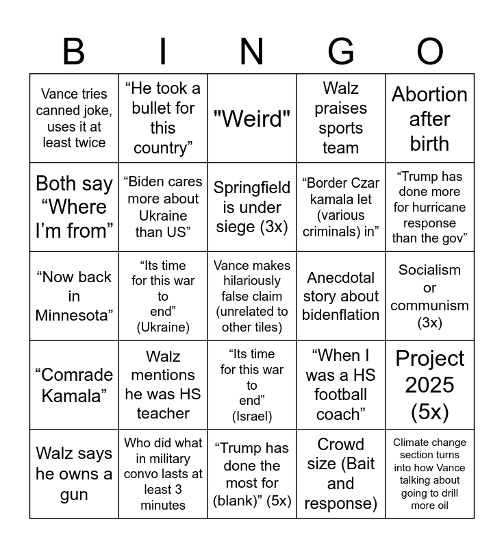 This bingo card has a free space and 24 words: Walz mentions he was HS teacher, Who did what in military convo lasts at least 3 minutes, Springfield is under siege (3x), Walz says he owns a gun, Abortion after birth, Vance tries canned joke, uses it at least twice, Both say “Where I’m from”, “He took a bullet for this country”, Anecdotal story about bidenflation, “Its time for this war to end” (Israel), “Border Czar kamala let (various criminals) in”, “Now back in Minnesota”, “When I was a HS football coach”, Project 2025 (5x), “Biden cares more about Ukraine than US”, Crowd size (Bait and response), Socialism or communism (3x), "Weird", “Trump has done more for hurricane response than the gov”, “Its time for this war to end” (Ukraine), Climate change section turns into how Vance talking about going to drill more oil, “Comrade Kamala”, Walz praises sports team and “Trump has done the most for (blank)” (5x).