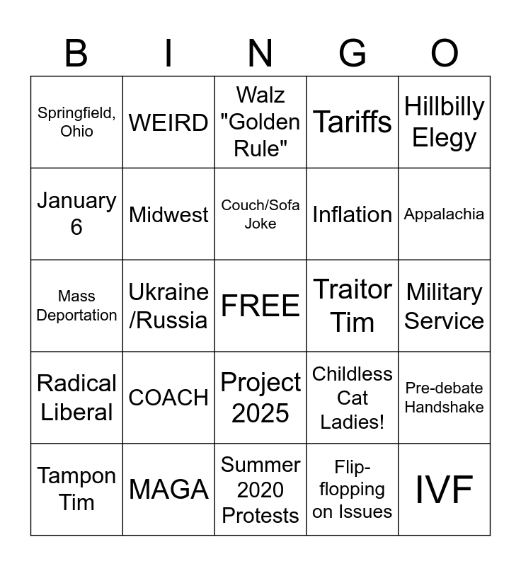 This bingo card has a free space and 24 words: COACH, MAGA, Couch/Sofa Joke, Tampon Tim, Hillbilly Elegy, Springfield, Ohio, January 6, WEIRD, Traitor Tim, Project 2025, Inflation, Mass Deportation, Childless Cat Ladies!, Pre-debate Handshake, Midwest, Flip-flopping on Issues, Military Service, Walz "Golden Rule", Appalachia, Ukraine /Russia, IVF, Radical Liberal, Tariffs and Summer 2020 Protests.