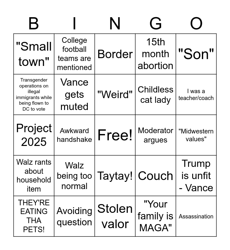 This bingo card has a free space and 24 words: Walz being too normal, Avoiding question, "Weird", THEY'RE EATING THA PETS!, "Son", "Small town", Transgender operations on illegal immigrants while being flown to DC to vote, College football teams are mentioned, Moderator argues, Taytay!, Childless cat lady, Project 2025, Couch, Trump is unfit - Vance, Vance gets muted, "Your family is MAGA", "Midwestern values", Border, I was a teacher/coach, Awkward handshake, Assassination, Walz rants about household item, 15th month abortion and Stolen valor.