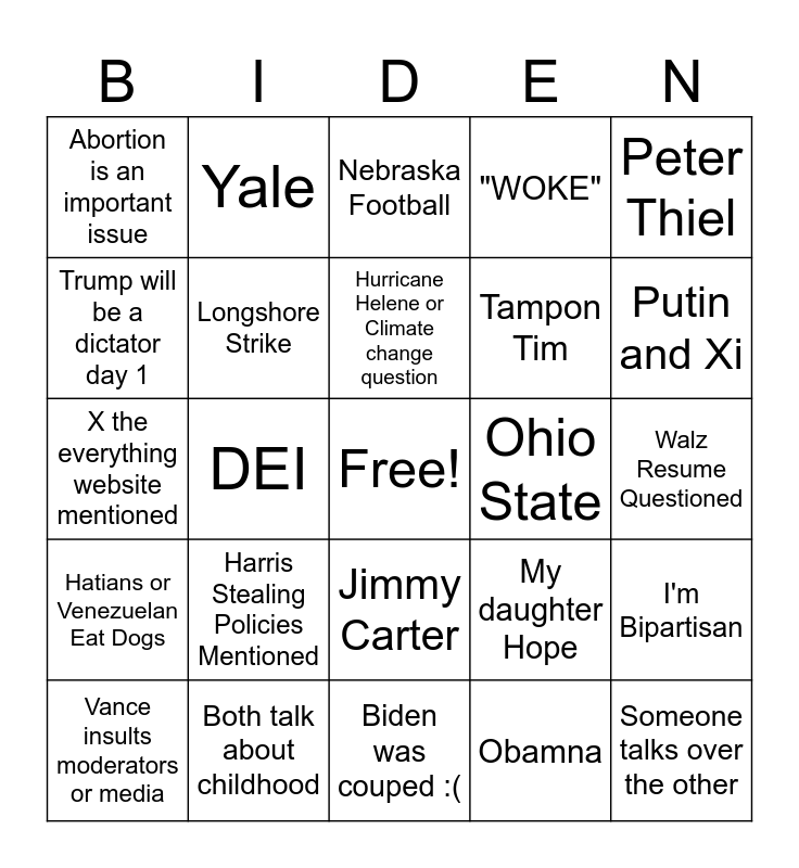 This bingo card has a free space and 24 words: Harris Stealing Policies Mentioned, Both talk about childhood, Hurricane Helene or Climate change question, Vance insults moderators or media, Peter Thiel, Abortion is an important issue, Trump will be a dictator day 1, Yale, Ohio State, Jimmy Carter, Tampon Tim, X the everything website mentioned, My daughter Hope, I'm Bipartisan, Longshore Strike, Obamna, Walz Resume Questioned, Nebraska Football, Putin and Xi, DEI, Someone talks over the other, Hatians or Venezuelan Eat Dogs, "WOKE" and Biden was couped :(.