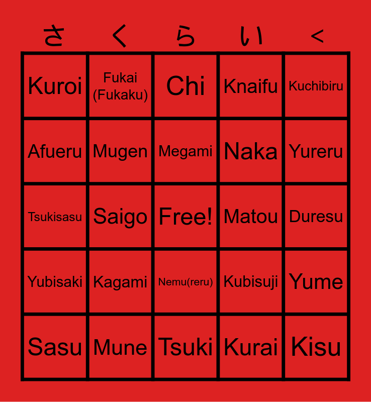 This bingo card has a free space and 27 words: Kubisuji, Yami, Naka, Tsuki, Afueru, Chi, Fukai (Fukaku), Yubisaki, Matou, Yume, Tsukisasu, Knaifu, Sasu, Mune, Yureru, Namida, Mugen, Megami, Kagami, Kuroi, Duresu, Kurai, Saigo, Kisu, Nemu(reru), Kuchibiru and Kichizuke.