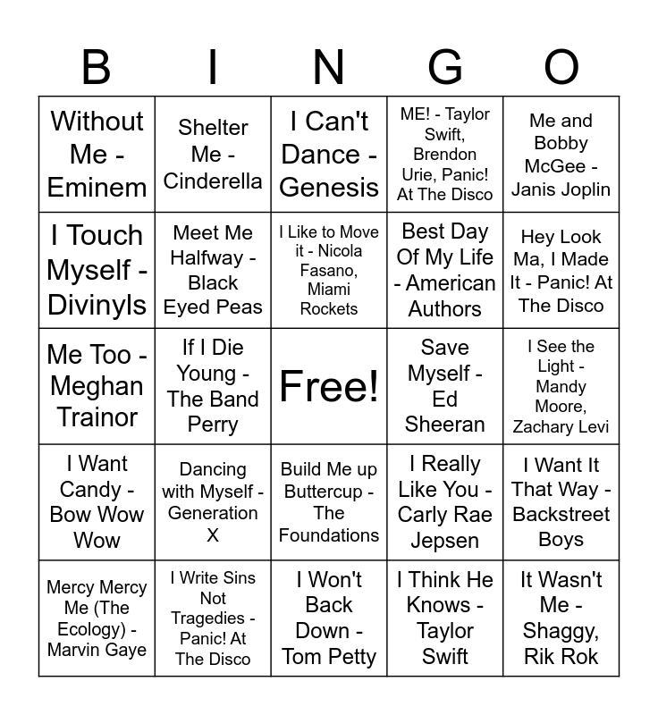 This bingo card has a free space and 75 words: I Love Rock 'N Roll - Joan Jett & the Blackhearts, I Can See Clearly Now - Johnny Nash, I Can't Dance - Genesis, I Don't Like It, I Love It - Flo Rida, Robin Thicke, Verdine White, I Got 5 On It - Luniz,Michael Marshall, I Got You Babe - Sonny & Cher, I Hate Myself for Loving You - Joan Jett & the Blackhearts, I Hate Everything About You - Three Days Grace, I Heard It Through The Grapevine - Marvin Gaye, I Hold On - Dierks Bentley, I Kissed A Girl - Katy Perry, I Like It, I Love It - Tim McGraw, I Like to Move it - Nicola Fasano, Miami Rockets, I Touch Myself - Divinyls, If I Had $1,000,000 - Barenaked Ladies, If I Die Young - The Band Perry, If I Could Turn Back Time - Cher, It Wasn't Me - Shaggy, Rik Rok, Because I Got High - Afroman, Me and Bobby McGee - Janis Joplin, Me and Julio Down by the Schoolyard - Paul Simon, Me Too - Meghan Trainor, Meet Me Halfway - Black Eyed Peas, Shelter Me - Cinderella, ME! - Taylor Swift, Brendon Urie, Panic! At The Disco, Here With Me - Marshmello, CHVRCHES, Let Me Go - Hailee Steinfeld, Alesso, Florida Georgia Line, WATT, Walk Me Home - P!nk, Rescue Me - OneRepublic, Rain On Me - Lady Gaga, Ariana Grande, I Like Me Better, Break My Heart, Count on Me - Bruno Mars, I Really Like You - Carly Rae Jepsen, Hey Look Ma, I Made It - Panic! At The Disco, Best Day Of My Life - American Authors, The Way I Am - Charlie Puth, Just Give Me a Reason - P!nk, Nate Ruess, I See the Light - Mandy Moore, Zachary Levi, I Think He Knows - Taylor Swift, Like I'm Gonna Lose You - Meghan Trainor, John Legend, Wake Me Up - Avicii, I Wanna Dance with Somebody - Whitney Houston, I Can't Help Myself (Sugar Pie, Honey Bunch) - Four Tops, Take on Me - a-ha, Take Me to Church - Hozier, Mercy Mercy Me (The Ecology) - Marvin Gaye, Without Me - Eminem, Bring Me To Life - Evanescence, Pour Me A Drink - Post Malone, Blake Shelton, Pour Some Sugar On Me - Def Leppard, Build Me up Buttercup - The Foundations, You Shook Me All Night Long - AC/DC, Call Me Maybe - Carly Rae Jepsen, There's Nothing Holdin' Me Back - Shawn Mendes, She Got the Best of Me - Luke Combs, Beer Never Broke My Heart - Luke Combs, Everything I Love - Morgan Wallen, She Had Me At Heads Carolina - Cole Swindell, As Good As I Once Was - Toby Keith, Dancing with Myself - Generation X, All By Myself - Céline Dion, If I Lose Myself - OneRepublic, Alesso, Feelin' Myself - will.i.am, Miley Cyrus, French Montana, Wiz Khalifa, Mustard, Talking to Myself - Linkin Park, Save Myself - Ed Sheeran, Me, Myself & Your Eyes - Knox, I Had Some Help - Post Malone, Morgan Wallen, I Am Not Okay - Jelly Roll, I Want It That Way - Backstreet Boys, I Want Candy - Bow Wow Wow, I Write Sins Not Tragedies - Panic! At The Disco, I Will Survive - Gloria Gaynor, I Won't Back Down - Tom Petty and I Love This Bar - Toby Keith.