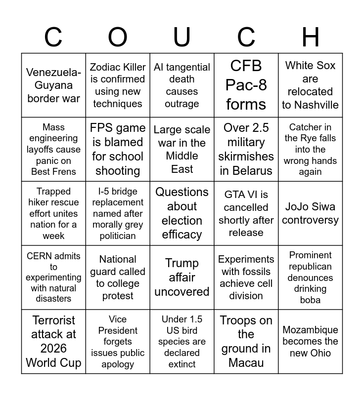 This bingo card has a free space and 24 words: National guard called to college protest, Vice President forgets issues public apology, Large scale war in the Middle East, Terrorist attack at 2026 World Cup, White Sox are relocated to Nashville, Venezuela-Guyana border war, Mass engineering layoffs cause panic on Best Frens, Zodiac Killer is confirmed using new techniques, GTA VI is cancelled shortly after release, Trump affair uncovered, Over 2.5 military skirmishes in Belarus, Trapped hiker rescue effort unites nation for a week, Experiments with fossils achieve cell division, Prominent republican denounces drinking boba, FPS game is blamed for school shooting, Troops on the ground in Macau, JoJo Siwa controversy, AI tangential death causes outrage, Catcher in the Rye falls into the wrong hands again, I-5 bridge replacement named after morally grey politician, Mozambique becomes the new Ohio, CERN admits to experimenting with natural disasters, CFB Pac-8 forms and Under 1.5 US bird species are declared extinct.