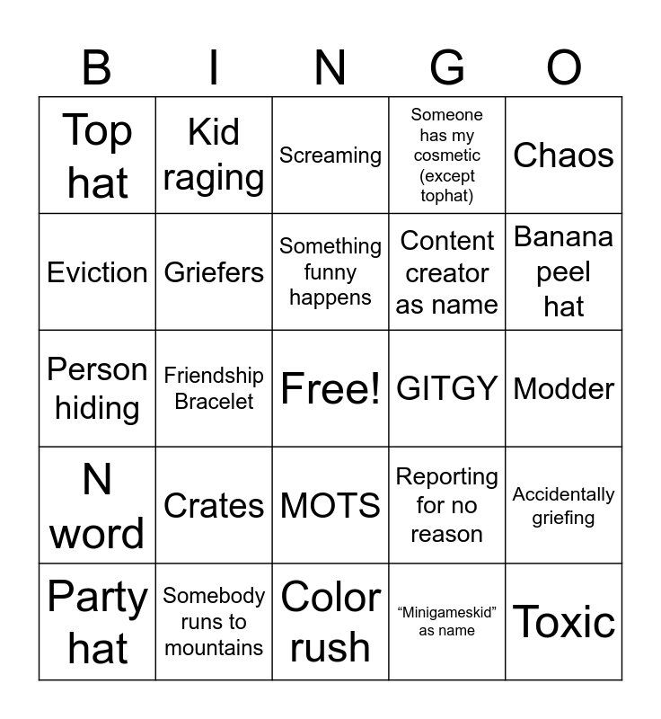 This bingo card has a free space and 29 words: Party hat, F slur, Friendship Bracelet, Brainrot, Top hat, Screaming, Griefers, Crates, GITGY, Somebody runs to mountains, Modder, Toxic, Color rush, “Minigameskid” as name, Banana peel hat, OG caves, MOTS, N word, Chaos, Person hiding, Reporting for no reason, 9 in the chamber, Content creator as name, Eviction, Someone has my cosmetic (except tophat), Kid raging, Accidentally griefing, Something funny happens and Cursed name.