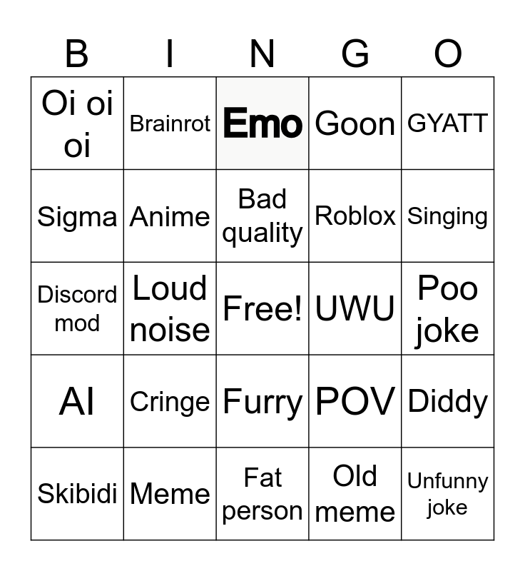 This bingo card has a free space and 24 words: Cringe, Meme, Bad quality, Skibidi, GYATT, Oi oi oi, Sigma, Brainrot, UWU, Furry, Roblox, Discord mod, POV, Diddy, Anime, Old meme, Poo joke, Emo, Singing, Loud noise, Unfunny joke, AI, Goon and Fat person.