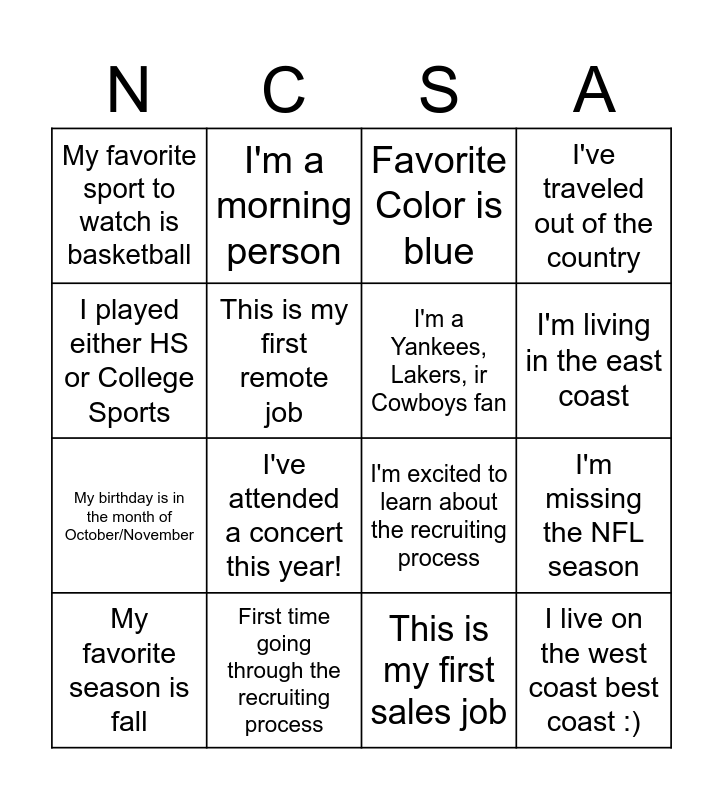 This bingo card has 16 words: First time going through the recruiting process, I'm missing the NFL season, Favorite Color is blue, My favorite sport to watch is basketball, My birthday is in the month of October/November, I'm a morning person, I'm excited to learn about the recruiting process, This is my first sales job, I played either HS or College Sports, This is my first remote job, My favorite season is fall, I've traveled out of the country, I've attended a concert this year!, I'm living in the east coast, I'm a Yankees, Lakers, ir Cowboys fan and I live on the west coast best coast :).