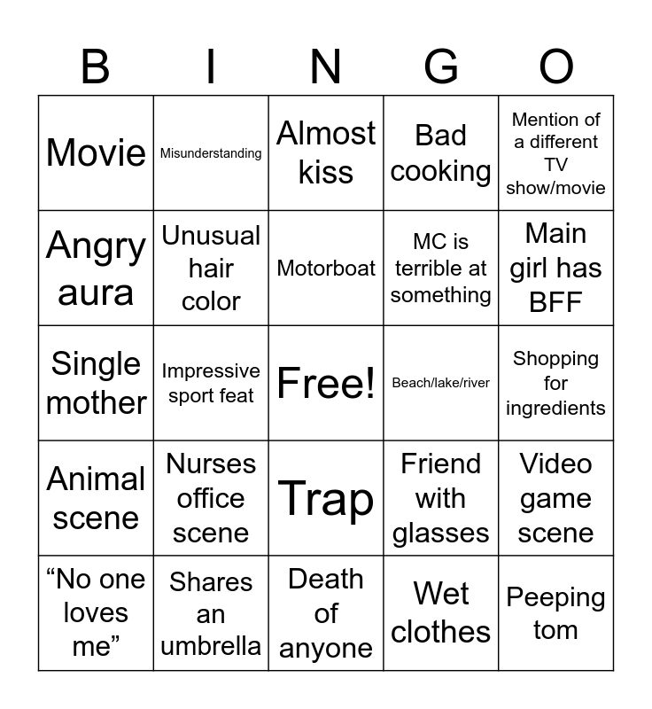 This bingo card has a free space and 24 words: “No one loves me”, Nurses office scene, Motorboat, Wet clothes, Mention of a different TV show/movie, Movie, Misunderstanding, Almost kiss, Beach/lake/river, Shopping for ingredients, Single mother, Unusual hair color, Friend with glasses, Video game scene, Angry aura, Shares an umbrella, Death of anyone, Bad cooking, Main girl has BFF, Animal scene, Impressive sport feat, Trap, MC is terrible at something and Peeping tom.