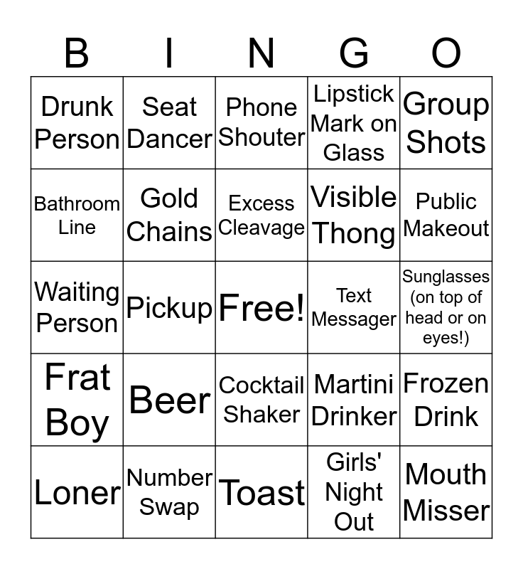 This bingo card has a free space and 24 words: Beer, Number Swap, Excess Cleavage, Loner, Group Shots, Drunk Person, Bathroom Line, Seat Dancer, Text Messager, Cocktail Shaker, Visible Thong, Waiting Person, Martini Drinker, Frozen Drink, Gold Chains, Girls' Night Out, Sunglasses (on top of head or on eyes!), Phone Shouter, Public Makeout, Pickup, Mouth Misser, Frat Boy, Lipstick Mark on Glass and Toast.