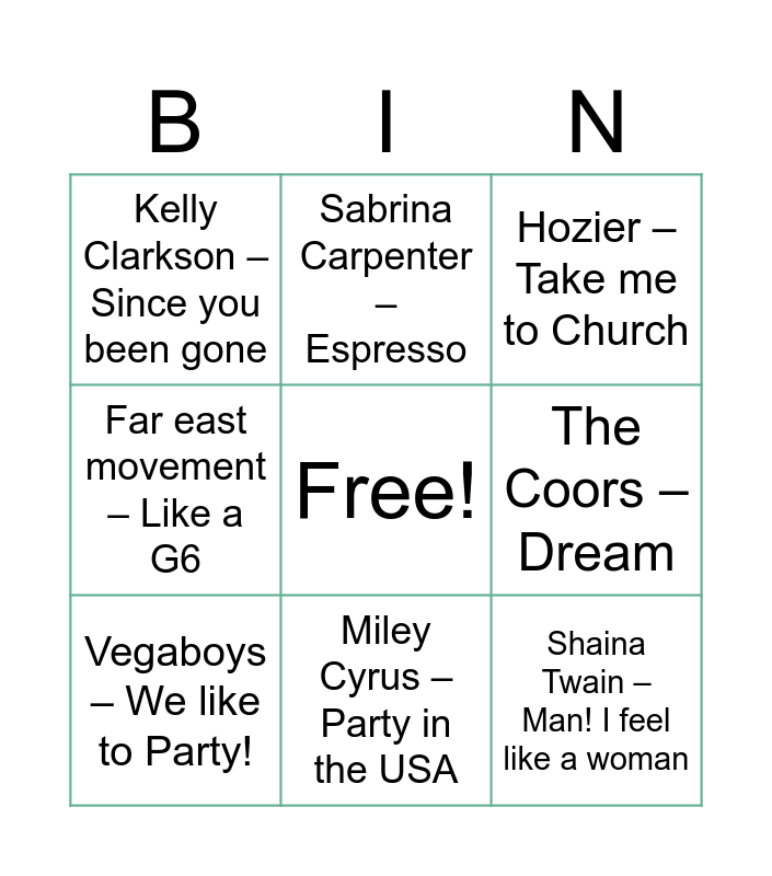 This bingo card has a free space and 36 words: Vannessa Carlton – A thousand miles, ABBA – Dancing Queen, Dizzie Rascal – Bonkers, Vegaboys – We like to Party!, Rhianna – Rude Boy, Spice Girls – Wannabe!, Miley Cyrus – Party in the USA, Britney Spears – Toxic, Shaina Twain – Man! I feel like a woman, Averil Lavigne – Sk8er Boi, Natasha Beddingfield – Unwritten, Far east movement – Like a G6, Shakira – Hips don’t lie, Lady Gaca – Bad Romance, Iyaz – Replay, Kelly Clarkson – Since you been gone, Christy Moore – Beeswing, U2 – Beautiful day, The Script – Hall of Fame, Hozier – Take me to Church, Sinead O’Connor – Nothing compares 2 u, Westlife – Uptown Girl, Eva Cassidy – Danny Boy, B*Witched – C-est La Vie, The High Kings – Galway Girl, Sabrina Carpenter – Espresso, Beyonce – Cuff it, Taylor Swift – Cruel summer, Cascada – Everytime we touch, The Coors – Dream, The Cranberries – Zombie, Thin Lizzy – Dancing in the Moonlight, The Dubliners – Black velvet band, Luke Kelly – The Fields of Athenry, Snow Patrol – Chasing Cars and The Wolfe Tones - The Streets of New York.
